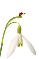 Veelkleurig Aziatisch lieveheersbeestje (Harmonia axyridis) op Sneeuwklokje (Galanthus nivalis) met witte achtergrond