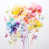 Prachtige, stijlvolle aquarel van bloemen in bloei in roze, rode, gele, blauwe en groene waterverf tinten.