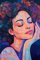 Met zijn zachte uitdrukking en levendige kleuren straalt dit portret rust en innerlijke tevredenheid uit. De harmonieuze geometrische vormen geven het kunstwerk een modern tintje dat perfect past in een gezellige woonkamer, waar het bewondering en ontspanning kan bevorderen. Een echte blikvanger die sfeer en stijl creëert.