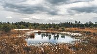 Voor wie mij nog niet kent, ik ben Fenna. Naast dat ik moeder van twee prachtige dochters ben en getrouwd ben met een hele lieve man ben ik ook fotografe. Van origine ben ik geen landschapsfotograaf, maar trouwfotograaf. Maar in mijn vrije tijd wandel ik veel. Heeeeel veel. Langzamerhand werk ik alle lange afstandsroutes af die er te vinden zijn in Drenthe. Deze foto heb ik vastgelegd tijdens een etappe van De Hondsrugroute. Een lange afstandswandeling van Groningen naar Osnabrück. We zitten aan het einde van de lente, en het begin van de zomer. Op het veen bij het Noordbargerbos laat zich het veenpluis volop zien. Met de reflectie in het water van de bomen, en de wolken die er boven grillig samentrekken levert dit een prachtig beeld op.