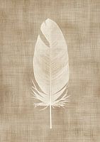 Veer Schilderij | Serene Plume - Dit abstracte schilderij toont een opvallend, enkelvoudig verbeeld element in de vorm van een veer, centraal geplaatst tegen een achtergrond die de textuur van ruw linnen doet denken. De veer is gedetailleerd weergegeven met fijne, haast uitgevlakte lijnen die de delicate structuur van de veerschachten benadrukken. Deze lijnen zijn zacht van toon, in tegenstelling tot de iets donkerder, meer geprononceerde achtergrond, wat een illusie van diepte creëert. Het palet gebruikt voornamelijk tinten beige en wit, wat zorgt voor een minimalistische en rustige uitstraling. Het overall beeld is zowel statisch als sereen, waardoor het schilderij een meditatief effect heeft. Dit verfijnde kunstwerk is een studie van eenvoud en natuurlijke schoonheid, uitgevoerd in een subtiel abstract realisme.