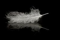 Een veer drijvend op het water. Door gebruik te maken van een zwarte achtergrond komt de witte veer mooi uit.
