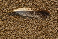 Een veer op het strand in het laatste licht van de dag. Het zachte, warme strijklicht laat de texturen van het zand en de veer mooi uitkomen. Een mooi en sereen beeld voor aan uw muur.