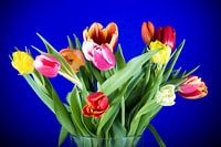 Een boeket van kleurrijke tulpen tegen een blauwe achtergrond.
