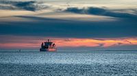 Een veerboot bij zonsondergang voor het Noordzee-eiland Norderney.