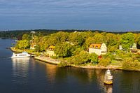Veerboot en baken in de archipel bij Stockholm, Zweden.