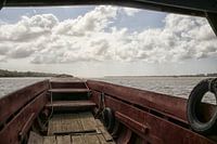 Houten boot die van de ene oever naar de andere vaart in Suriname