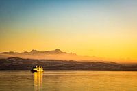 Sfeervolle foto van veerboot op Bodenmeer met uitzicht op Zwitserse Alpen bij zonsondergang in Duitsland
