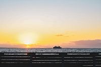 De veerboot tussen Fynshav en Bøjden bij zonsondergang.