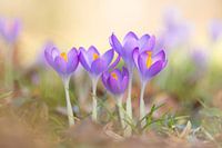 Krokussen in een weiland tegen een subtiel verlichte achtergrond.