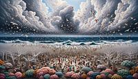 Dit suggestieve kunstwerk schetst een aangrijpend beeld van de klimaatcrisis. Ooit bloeiende koraalriffen zijn gebleekt en verlaten, en vogels vliegen door de lucht in chaotische patronen, symbool voor de verstoorde ritmes van de natuur's. Toch schijnt er een baken van hoop door: kinderen uit alle hoeken van de wereld verenigen…