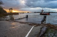 De pont van veerdienst de Biesbosch (Blue Amigo) vertrekt vanaf de Kop van 't Land aan de Brabantse kant van de Nieuwe Merwede naar de Zuid-Hollandse kant op een dag in de herfst met wisselende wolkenluchten. De ondergaande zon zorgt onverwacht nog even voor een warme tintje...