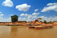 Prachtige opname van de pont in Madagaskar die zich klaar maakt om de rivier over te steken met auto's van toeristen en lokalen aan boord, op een mooie zomerse dag met zon en wolken