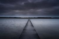 In Zeeland aan het Veerse meer ligt een lange steiger en op deze ochtend waren er flinke regen en onweerswolken in de lucht wat voor een donkere schouwspel over het water maakte.