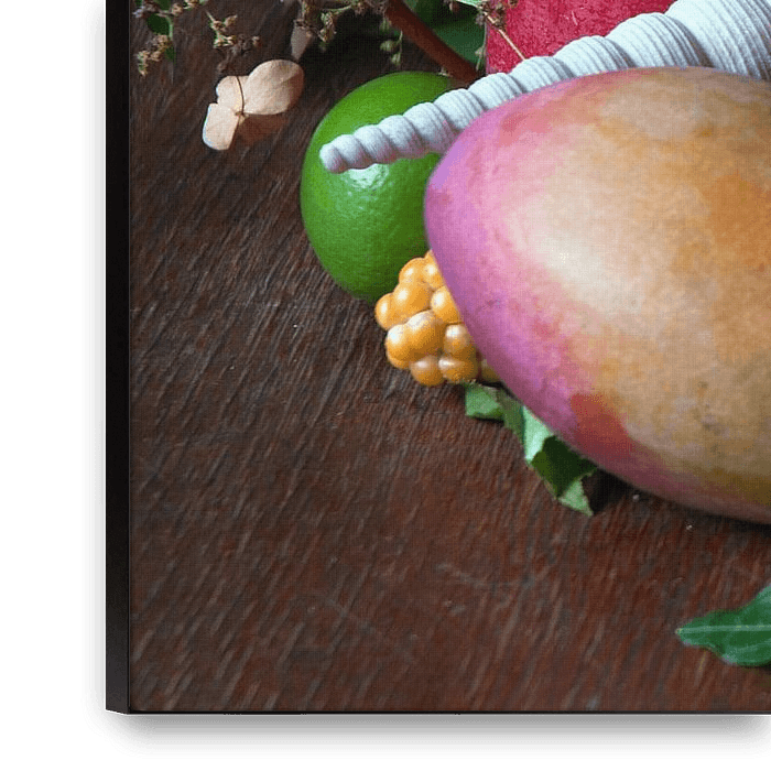 Een charmant fotografisch stilleven met vers fruit, natuurlijke decoratie, rode vogel en maritieme gevonden voorwerpen in de typische kleuren van de Indische zomer, zoals rood, oranje, paars en geel.
