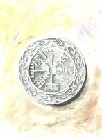 Deze aquarel toont een medaillon met het motief van het Vikingkompas "Vegvisir", aan de rand voorzien van prachtige versieringen. De Vegvisir is behulpzaam bij het vinden van de eigen weg.