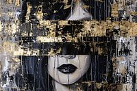 Veiled Boldness - Modern vrouwelijk portret, goudaccenten, abstracte elegantie