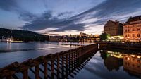 De stad Praag, Tsjechië, gezien vanaf de rechteroever van de Vltava net na zonsondergang