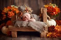 Een pasgeboren baby slaapt vredig op een klein rustiek houten bed, gewikkeld in zacht linnen. Hij draagt een gehaakte muts met herfstversieringen van bladeren, veren en bloemen. Rondom stralen warme herfstkleuren - oranje, goud, roest en crème - in de vorm van pompoenen en bloemen. De donkere houten achtergrond geeft het tafereel een…