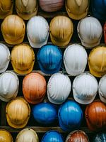 Een verzameling veiligheidshelmen in het Juttersmuseum Flora op Texel