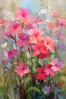 Veld met Roze Bloemen - Op dit bloemen schilderij zie je een levendig veld vol overwegend roze en rode bloemen, met een zachte achtergrond die de kleuren nog meer laat stralen in een moderne, impressionistische stijl.