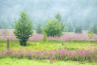 Groot veld vol met Vingerhoedskruid op een regenachtige dag op de Hoge Venen. De Hoge Venen ligt in de Ardennen op de grens met Belgie en Duitsland.