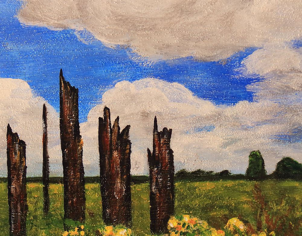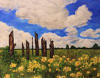 Moderne kunst schilderij met een veld met bloemen, boom stammen en witte wolken in de blauwe lucht.