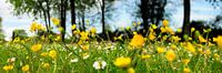 Een panorama van een veld met boterbloemen. Een zonnig lentebeeld waarbij de kijker tussen de wilde bloemen doorkijkt. Verder zit er tussen het gras nog madeliefjes om het geheel nog vrolijker te maken.