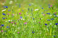 Een beeldvullende opname van diverse grassen, korenbloemen, robertskruid en margrieten.