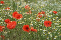 Kleurrijk veld met rode klaprozen en kamille bloemen met gele harten