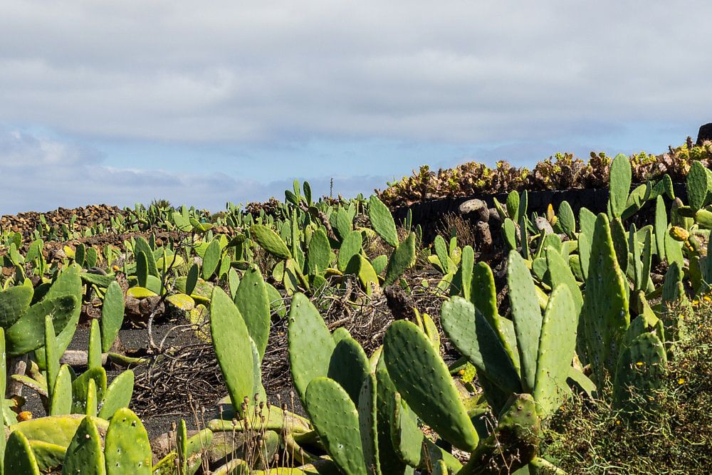 Veld met stekelperen en windmolen op de achtergrond op het Canarische eiland Lanzarote