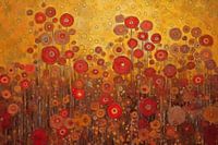 "Veld van Rode Cirkels" toont een levendig landschap bezaaid met rode en oranje cirkels die lijken op bloemen die bloeien onder een gouden hemel. De kleurvariaties van diep rood tot fel oranje creëren een warme en uitnodigende sfeer. De cirkels, variërend in grootte, zorgen voor een dynamisch en speels effect, dat doet denken aan een veld vol bloemen in volle bloei. Dit werk is geïnspireerd door de natuurlijke schoonheid van een bloeiend veld en vangt de essentie van een zomerse dag. Perfect voor het verfraaien van elke ruimte met een vleugje natuur en warmte.