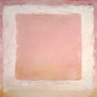 "Veld van Zacht Licht" is een rustig en evenwichtig abstract werk met een vierkant in het midden, opgebouwd uit zachte tinten roze en perzik. De kleuren lopen vloeiend in elkaar over, met wazige randen en een lichte, bijna transparante achtergrond.