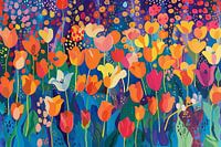 'Veld vol Vreugde' is een uitbarsting van kleur die het hart vrolijk maakt. Een zee van tulpen in warme tinten van oranje, rood, geel en zachte roze tonen vult het canvas, alsof het een feestdag is in de natuur. Tussen de bloemen door fladderen vrolijke vlinders, waardoor het tafereel tot leven komt met beweging en gratie. Het schilderij weerspiegelt de vreugde van een zonnige dag in een veld vol bloemen, waar de lucht gevuld is met de glinstering van het licht dat reflecteert op dauwdruppels. Dit werk is geïnspireerd door de eenvoudige schoonheid van de natuur en de pure blijdschap die het ons brengt. Het is de perfecte toevoeging aan een ruimte die wel wat opgewektheid kan gebruiken, en het zorgt voor een dagelijkse dosis lente, het hele jaar door.