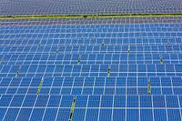 Veld vol blauwe zonnepanelen op een rij voor energievoorziening bij een bedrijf. Deze foto is helemaal gevuld met zonnecollectoren die energie opwekken in het landschap.