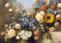 Een prachtig boeket van veldbloemen en rozen. Met zorg gecomponeerd en vertrokken vanuit een schets en kleurtekening is dit stilleven tot stand gekomen. In een prachtige, dromerige vintage stijl.