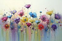 Dit werk toont een abstracte en levendige weergave van veldbloemen. De bloemen zijn op een speelse manier weergegeven, met vloeiende vormen en een rijk palet van kleuren die variëren van warme tinten tot koele accenten. Het werk roept de vrije geest van een veld op, waar de bloemen in de wind dansen. De kleuren en vormen geven een…