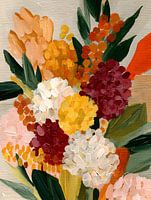 Een vrolijk en krachtig boeket met oranje, geel en roze bloemen, vol energie en zomerse warmte.