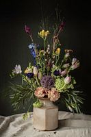 Dit kleurrijke veldboeket in een keramieken vaas straalt natuurlijke elegantie en verfijning uit. De rijke schakering aan bloemen komt tot leven tegen de donkere achtergrond. Een moderne interpretatie van het klassieke stilleven.