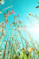 Digitaal schilderij van een veldboeket, met o.a. margrieten, tegen een blauwe lucht. De zonnestralen maken het zomerse beeld compleet en geven dit werk een frisse uitstraling.