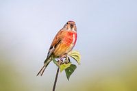 Veldleeuwerik mannetje zittend op een tak tussen de bladeren