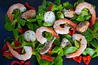 Veldsla met pepers en zeevruchten op een zwarte serveerschotel