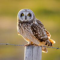De velduil is even neergestreken op het hek van een weiland en kijkt recht in de camera. Zijn verenkleed wordt verlicht door de middernachtzon.