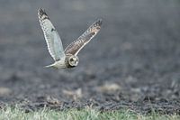 Velduil in vlucht met de vleugels geheel omhoog vliegend over een weiland