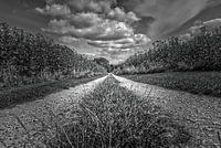 Veldweg met grasstrook in het midden tussen hoge, begroeide landbouwgrond onder contrasterende bewolkte hemel