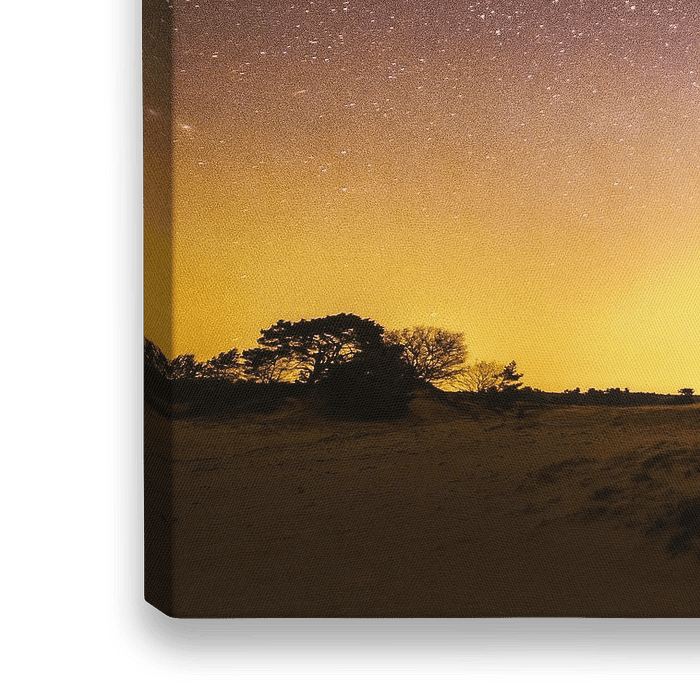 Melkweg gefotografeerd op de Nederlandse Veluwe, Kootwijkerzand. De gele gloed is de lichtvervuiling. Deze opname is gemaakt in mei, waarbij de melkweg mooi horizontaal aan de hemel staat, net boven de lichtvervuiling.