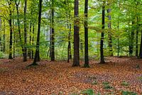 Bomen op de Veluwe in de buurt van de Loenense Waterval bij Loenen tijdens de herfst. De bomen zijn in herfstkleuren, terwijl de bodem bezaaid is met afgevallen bladeren.