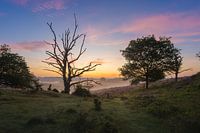 De Veluwezoom bij de Posbank bij zonsopkomst. Met gras, bomen heide en natuurlijk sfeervolle ochtendnevel.