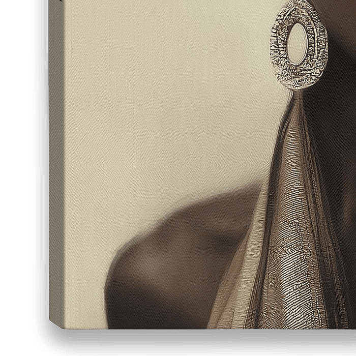 “Velvet Essence” is een elegant en verfijnd portret dat tijdloze schoonheid, rust en innerlijke kracht uitstraalt. Centraal in het kunstwerk staat een vrouw die licht gedraaid is afgebeeld, waardoor haar houding een natuurlijke en gracieuze uitstraling krijgt. Haar blik is kalm, zelfverzekerd en doordringend, waarbij haar ogen direct de…