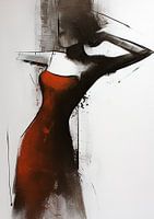 Velvet Motion - Dit abstracte schilderij toont een gestileerde vrouw in een levendige roestrode jurk, met krachtige zwarte en grijze abstracte elementen die de vorm en beweging benadrukken.